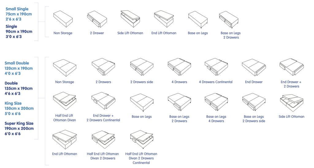 All mattresses are available in all these sizes with all these base options.